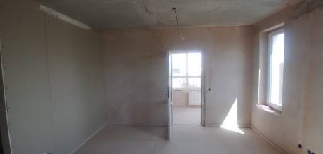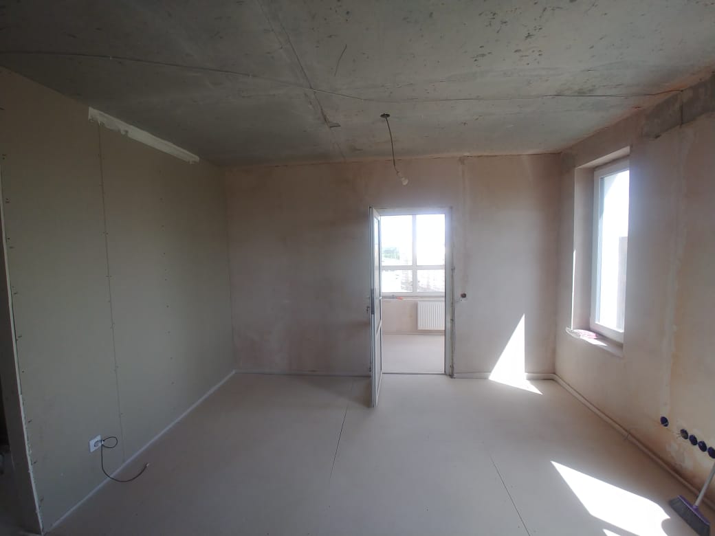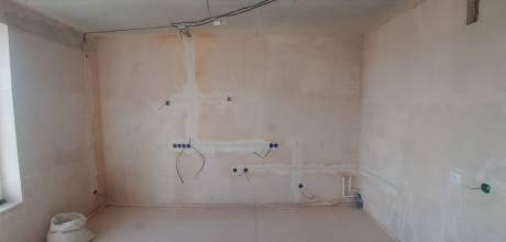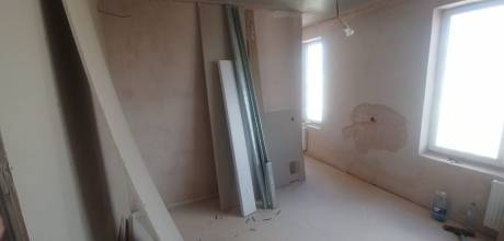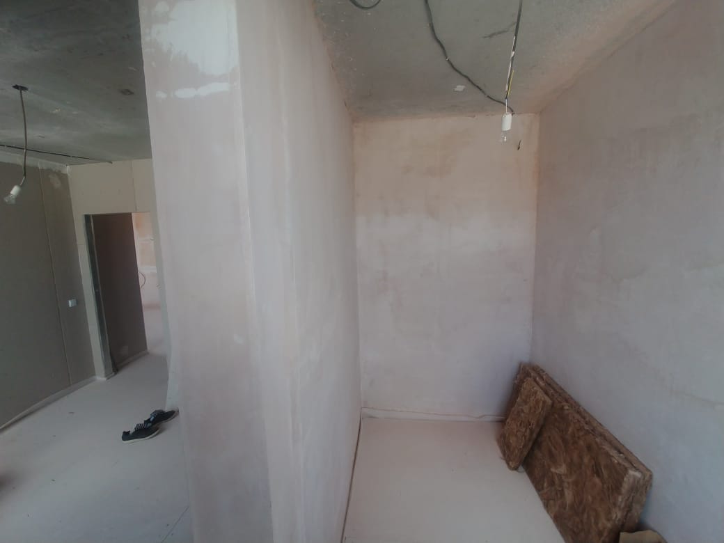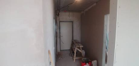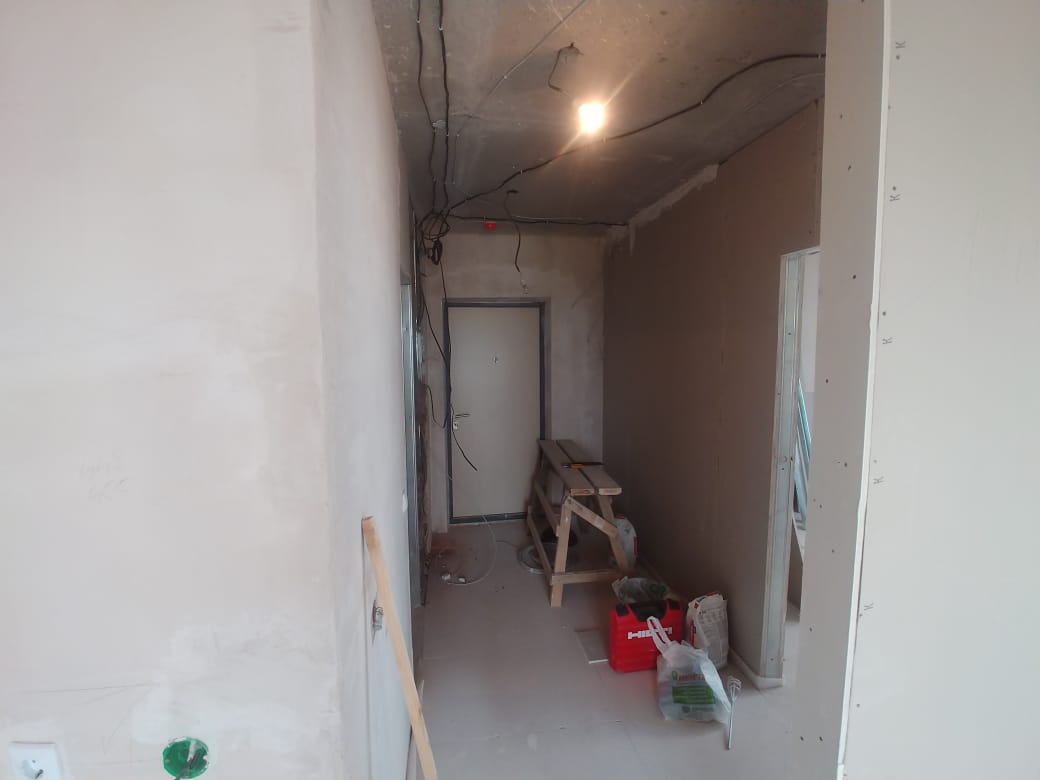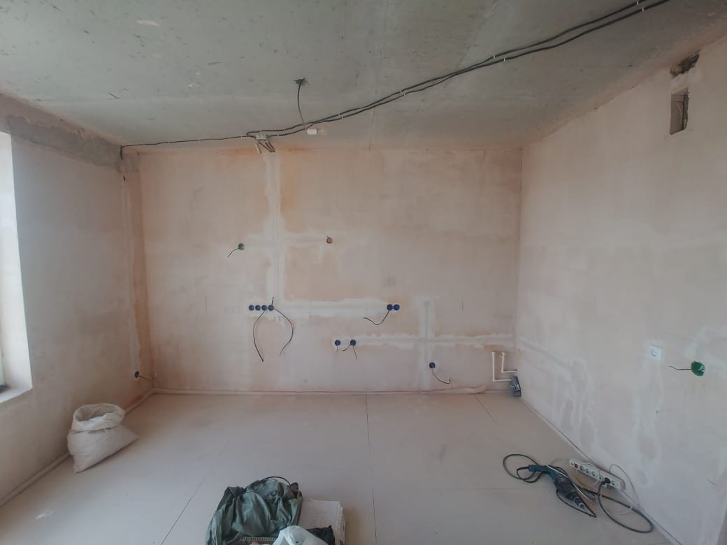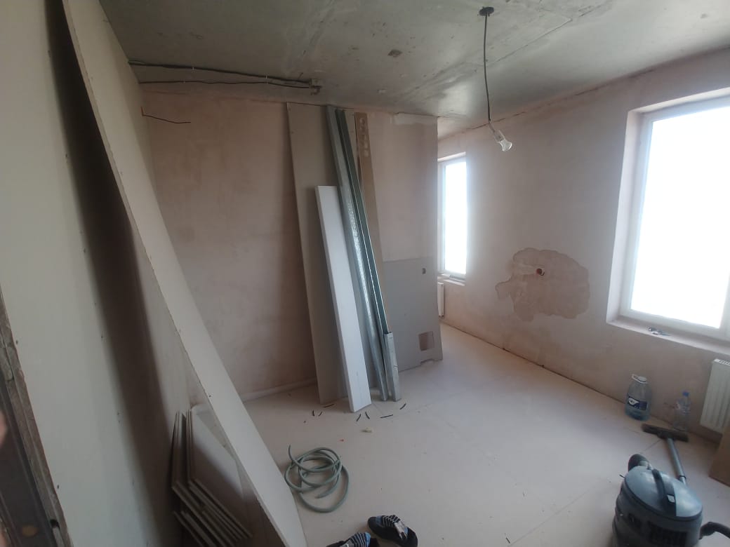 Примерная площадь стен 120 м2. Оштукатуренные стены выровнять в зоне кухни и кабинета (маленький закуток с утеплителем на фото). И в четырёх местах заново оштукатурить, т.к. от застройщика штукатурка отпала. Ну и потом зашпаклевать гипсокартонные стены и всю квартиру подготовить под поклейку обоев.