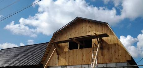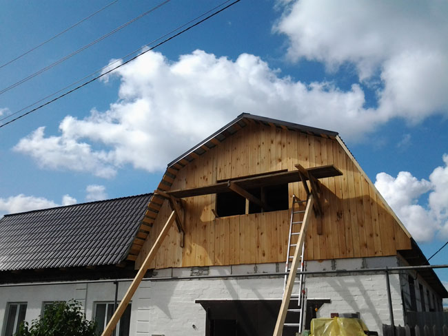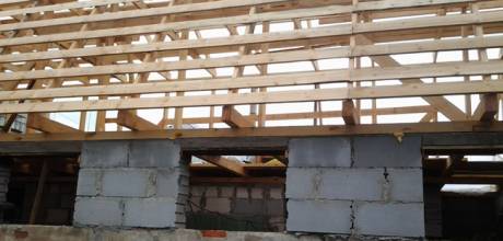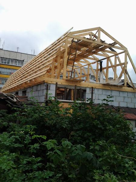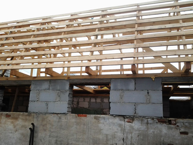 Длина сооружения 16 м, стропила пологой части крыши 2,4 м., стропила крутой части 2,9 м., пеноблоки БГМ 39 шт. –это простенки между оконными проемами и 10 над воротами.